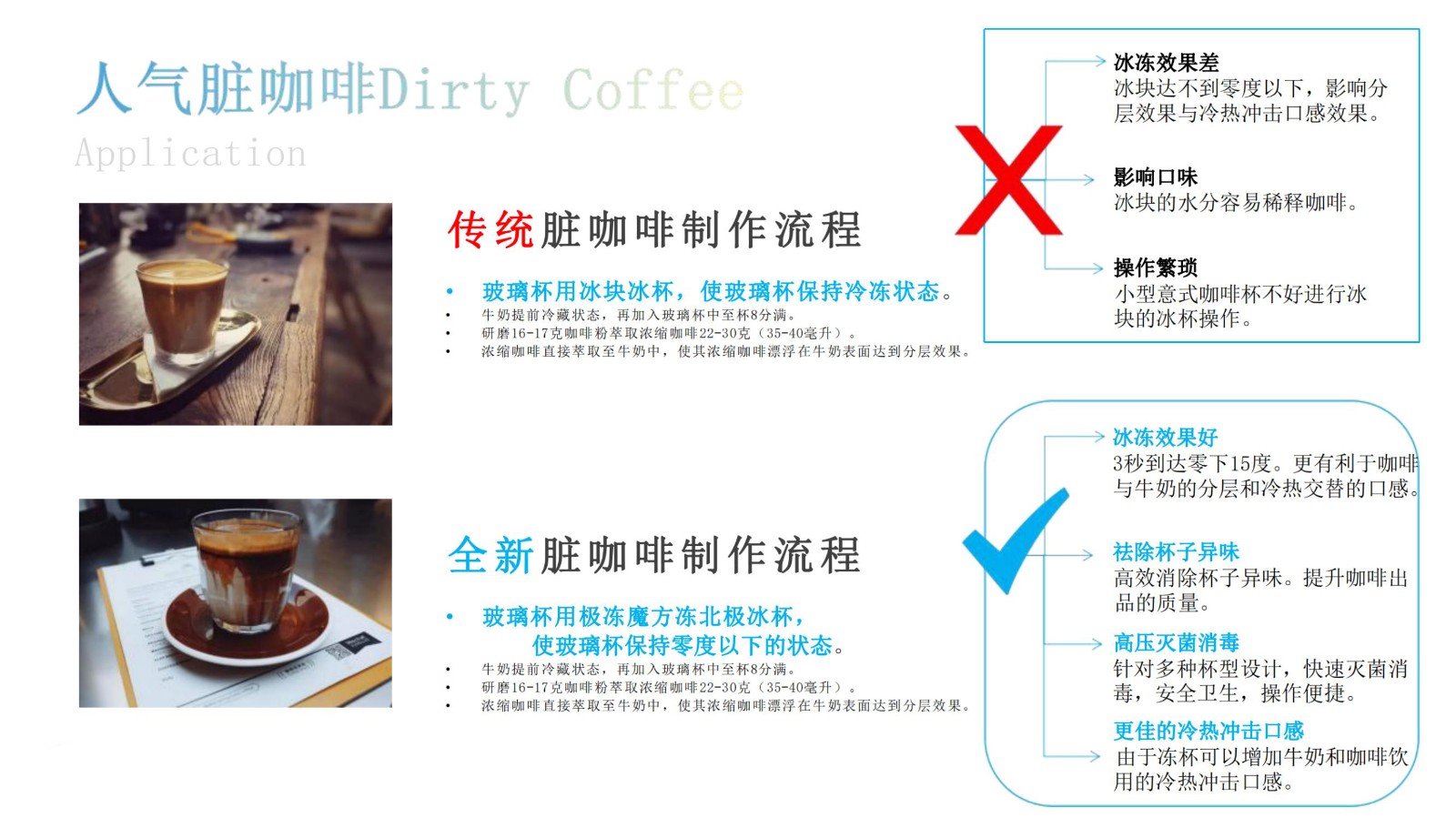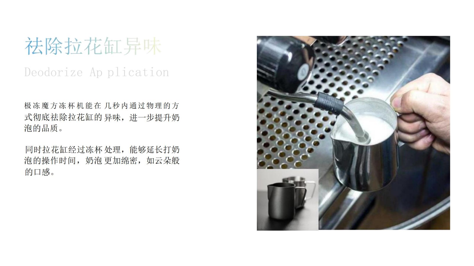 極凍魔方凍杯機針對連鎖咖啡店的咖啡制作流程設計,快速滅菌,凍杯,祛味三合一。加快咖啡的出品,提高咖啡的品質!同時,針對奶缸,杯具的異味,做到100%祛除!