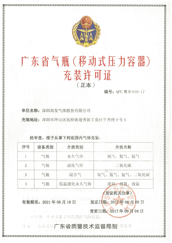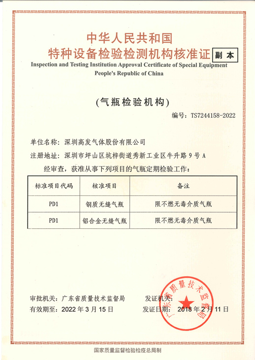 作為華南地區(qū)領(lǐng)先的氣體企業(yè),高發(fā)氣體不 僅擁有《廣東省氣瓶(移動(dòng)式壓力容器) 充裝許可證》,依法合規(guī)的進(jìn)行氣瓶灌沖, 確保每一瓶氣體都能安全,高質(zhì)量的出廠。 同時(shí)我們還是深圳地區(qū)唯一獲得國(guó)家認(rèn)證的 氣瓶檢驗(yàn)機(jī)構(gòu),長(zhǎng)期為百事可樂,朝日啤酒 等國(guó)內(nèi)外品牌進(jìn)行氣瓶檢測(cè),確保用氣安全。